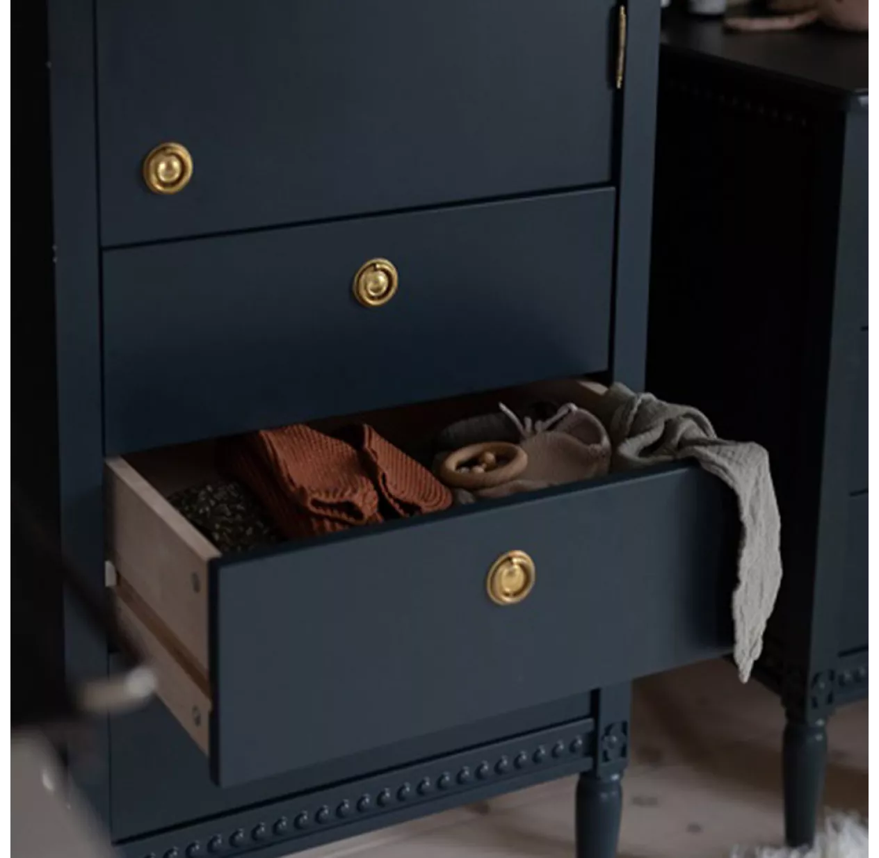 L’armoire Gustavienne offre 1 porte et 3 tiroirs. Son design classique, romantique et décalé est inspiré du style gustavien. Une rose sauvage sculptée au-dessus de chaque pied et des perles gravées dans le bois sur le pourtour, la ligne de mobilier Gustavienne apporte fraîcheur et poésie dans l’univers de l’enfant. Sa créatrice Nathalie, souhaitait un mobilier raffiné en bois massif fabriqué selon la tradition et le savoir-faire des menuisiers du XVIIème siècle.