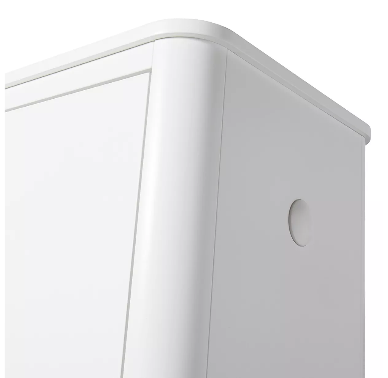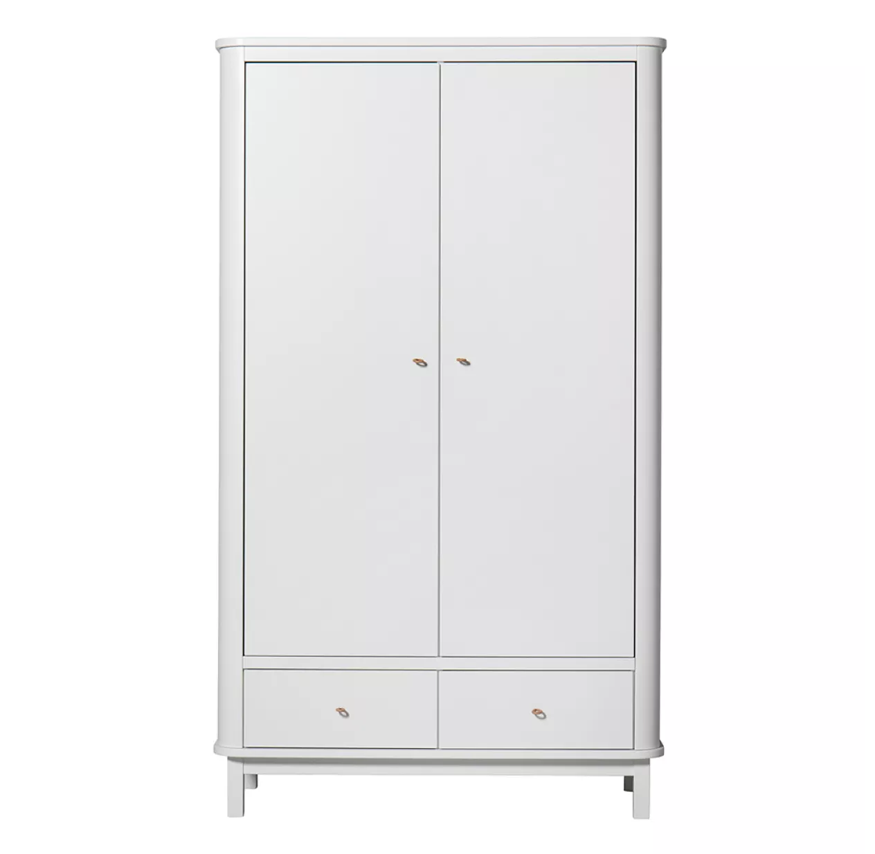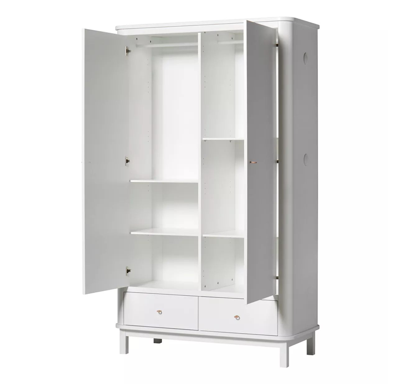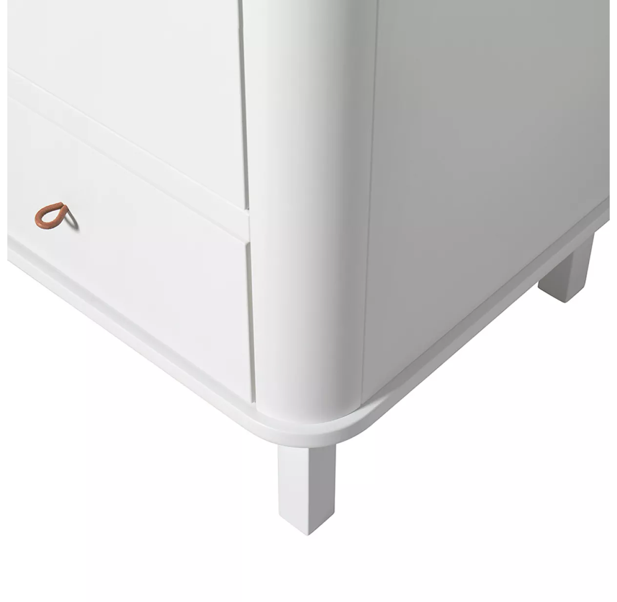 Conçue artisanalement et dans la tradition du design scandinave, cette armoire blanche issue de la collection Wood a été fabriquée pour durer. Elle possède 2 tringles, 2 tiroirs et de nombreux compartiments de rangement. Les poignées sont en cuir et sont fabriquées à la main. Elle dispose également de petits portants ronds sur les côtés, extensibles qui se tirent facilement, pour suspendre des vêtements ou un sac. Cette armoire aux lignes sobres apportera de la douceur dans la chambre de vos enfants.