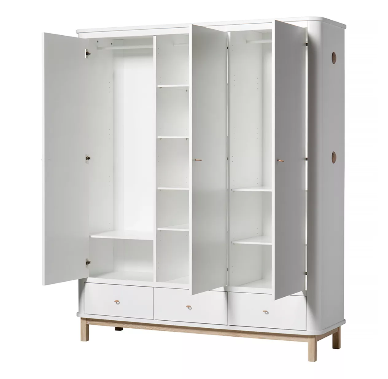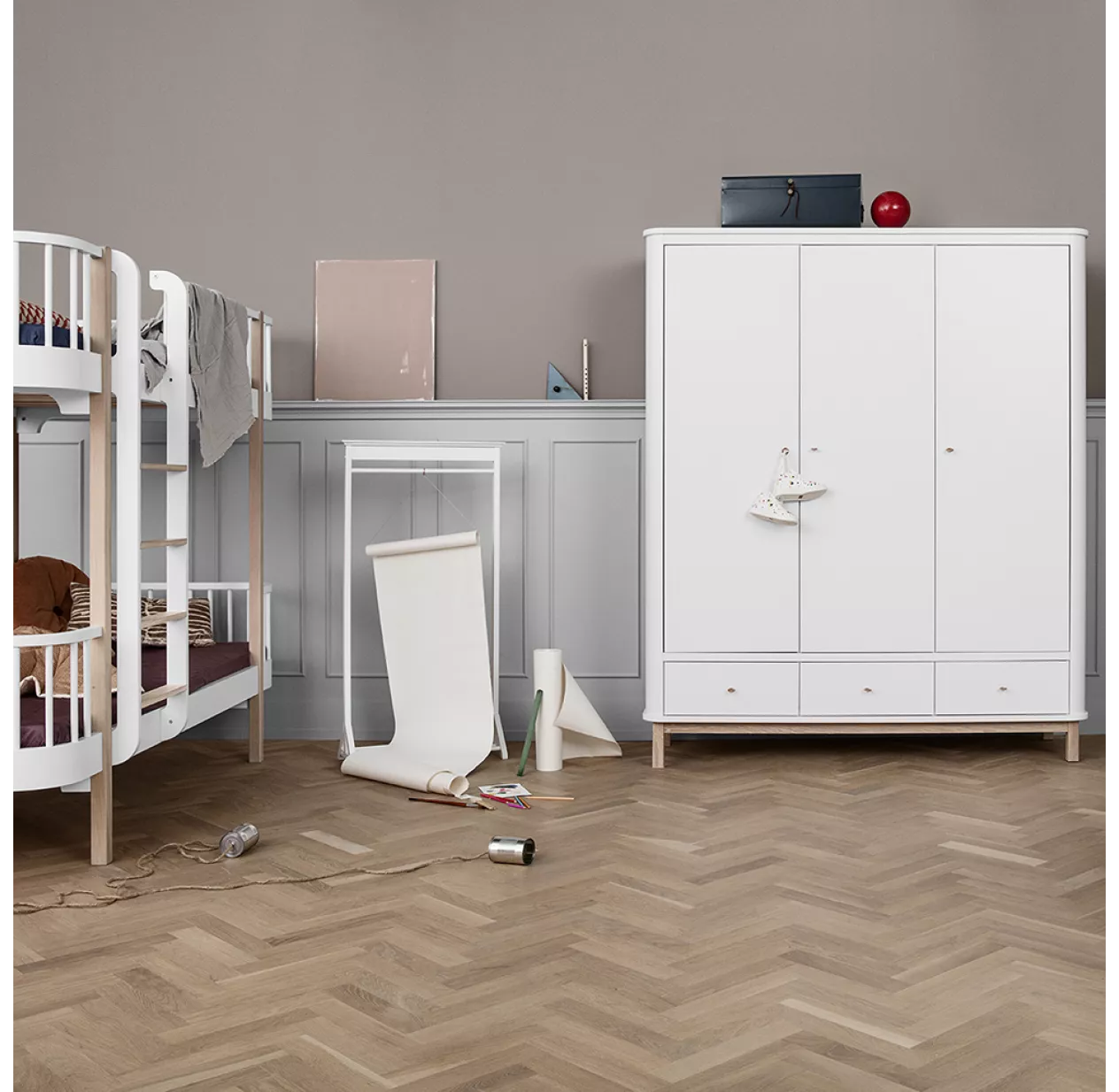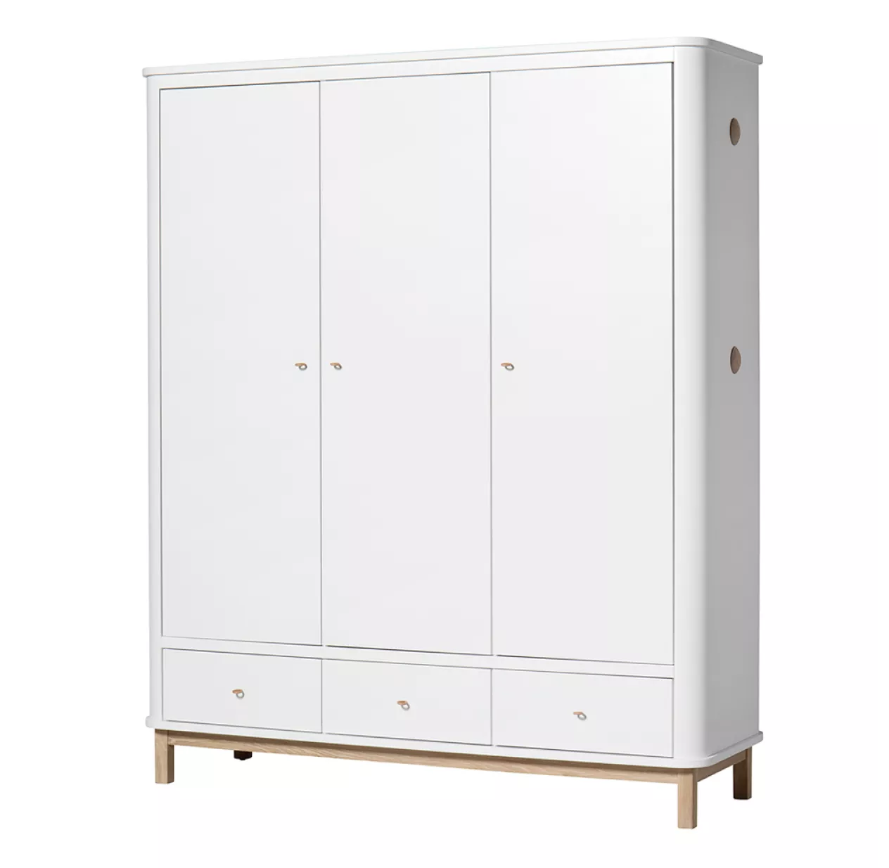 Cette armoire 3 portes blanche et en chêne issue de la collection Wood, est idéale pour une chambre d’enfant. De conception artisanale et durable, elle est fabriquée dans le respect du design scandinave. Des lignes douces et arrondies, pour une chambre à la décoration pleine de poésie. Les poignées sont en cuir et sont fabriquées à la main. L’armoire possède 3 tringles, 3 tiroirs et de nombreux compartiments de rangement. Elle dispose également de petits portants ronds sur les côtés, extensibles qui se tirent facilement, pour suspendre des vêtements. Craquez pour cette jolie armoire, fonctionnelle et design.