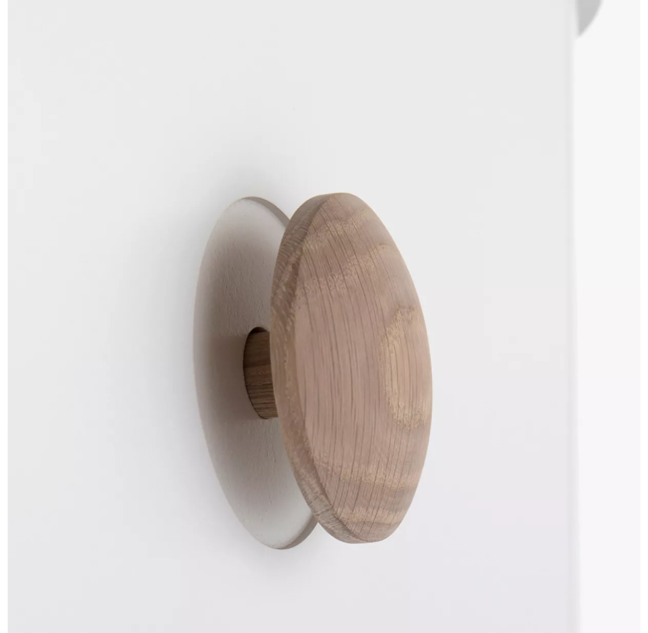 L’armoire est disponible avec les pieds en chêne massif ou en bouleau laqué blanc.