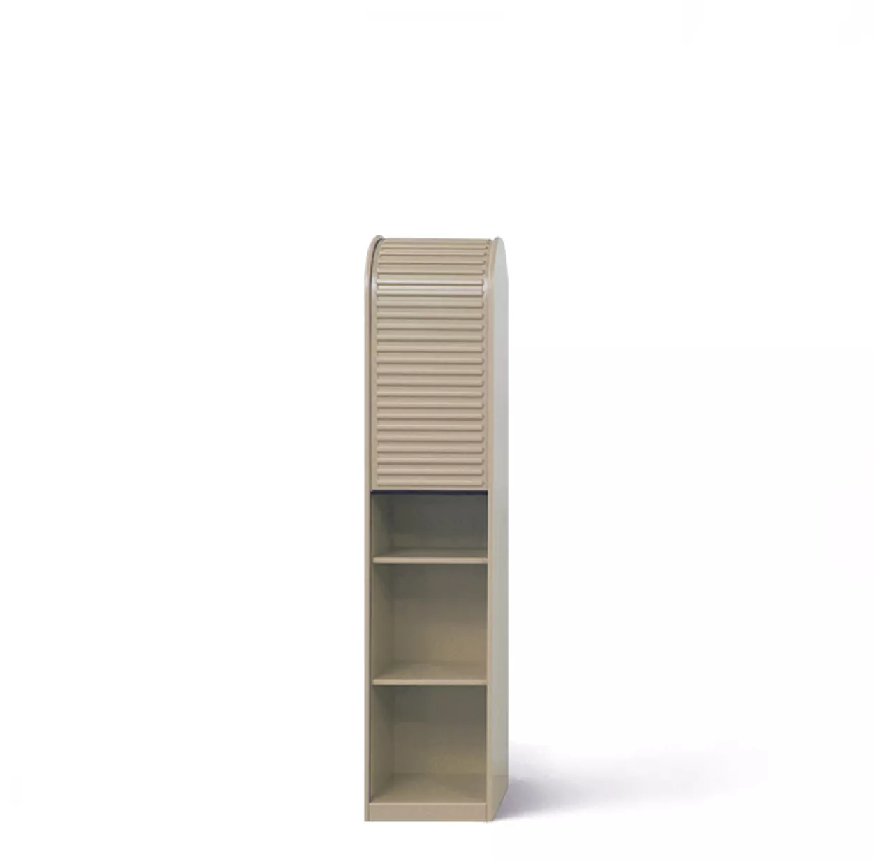 Le système d’armoire A’Dammer (à prononcer Amsterdammer) est inspiré des bornes de stationnement d’Amsterdam. Son volet roulant cannelé est comme une marque de fabrique. Il glisse vers le haut et disparaît à l’arrière de l’armoire. Les cannelures du volet font office de poignée quelle que soit la hauteur. L’arrondi de la partie supérieure de l’armoire A’Dammer renforce encore son originalité.