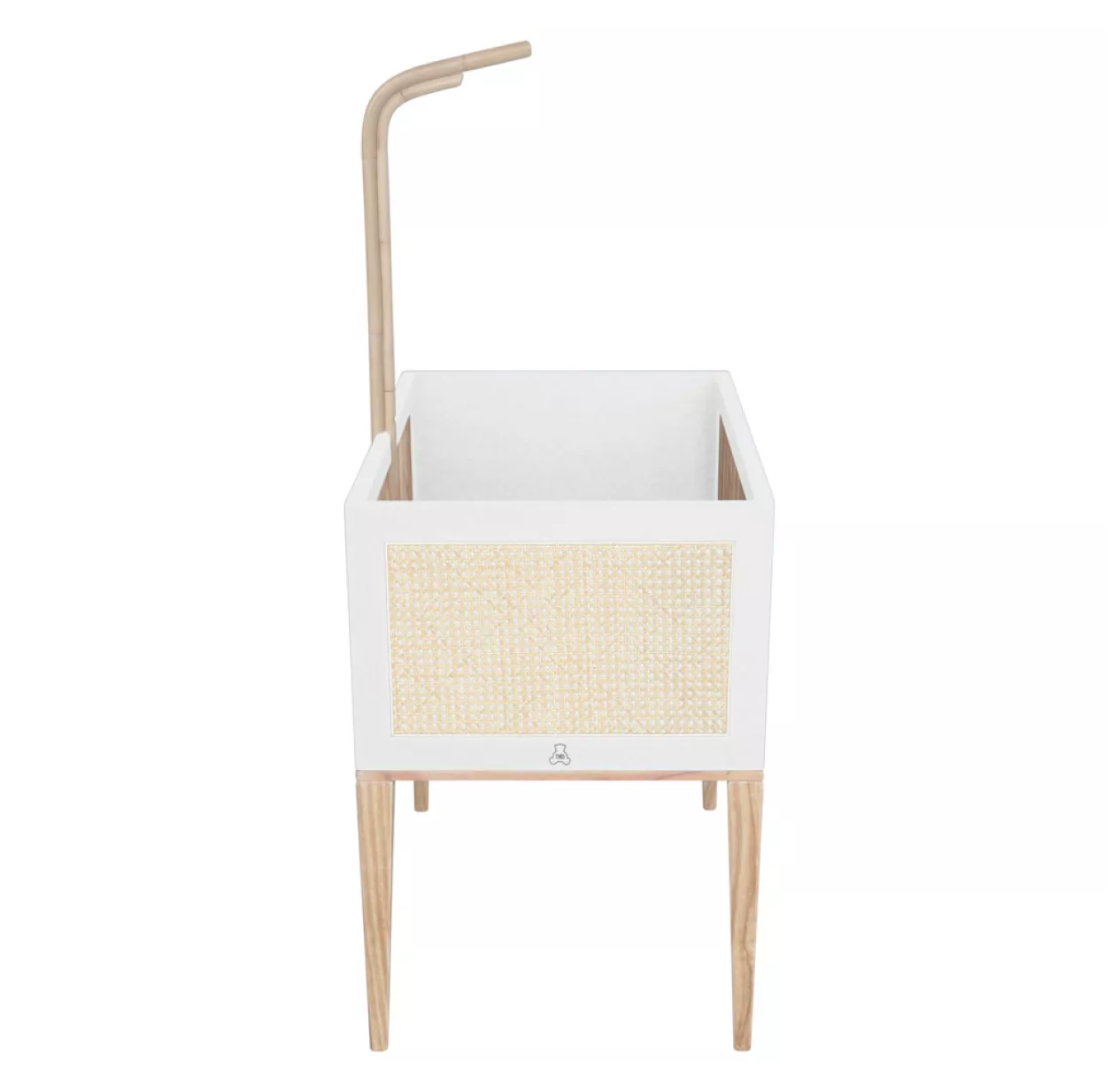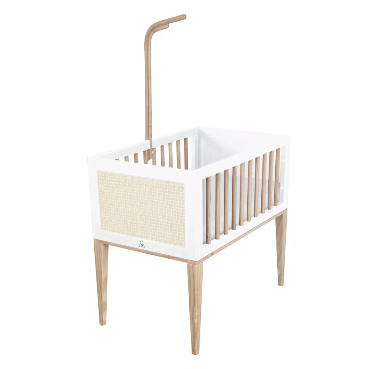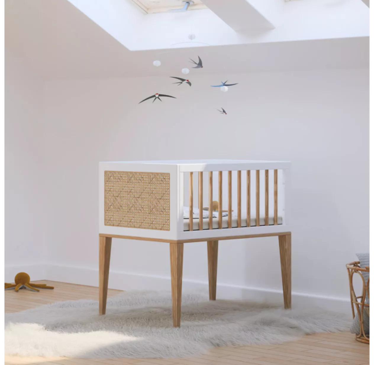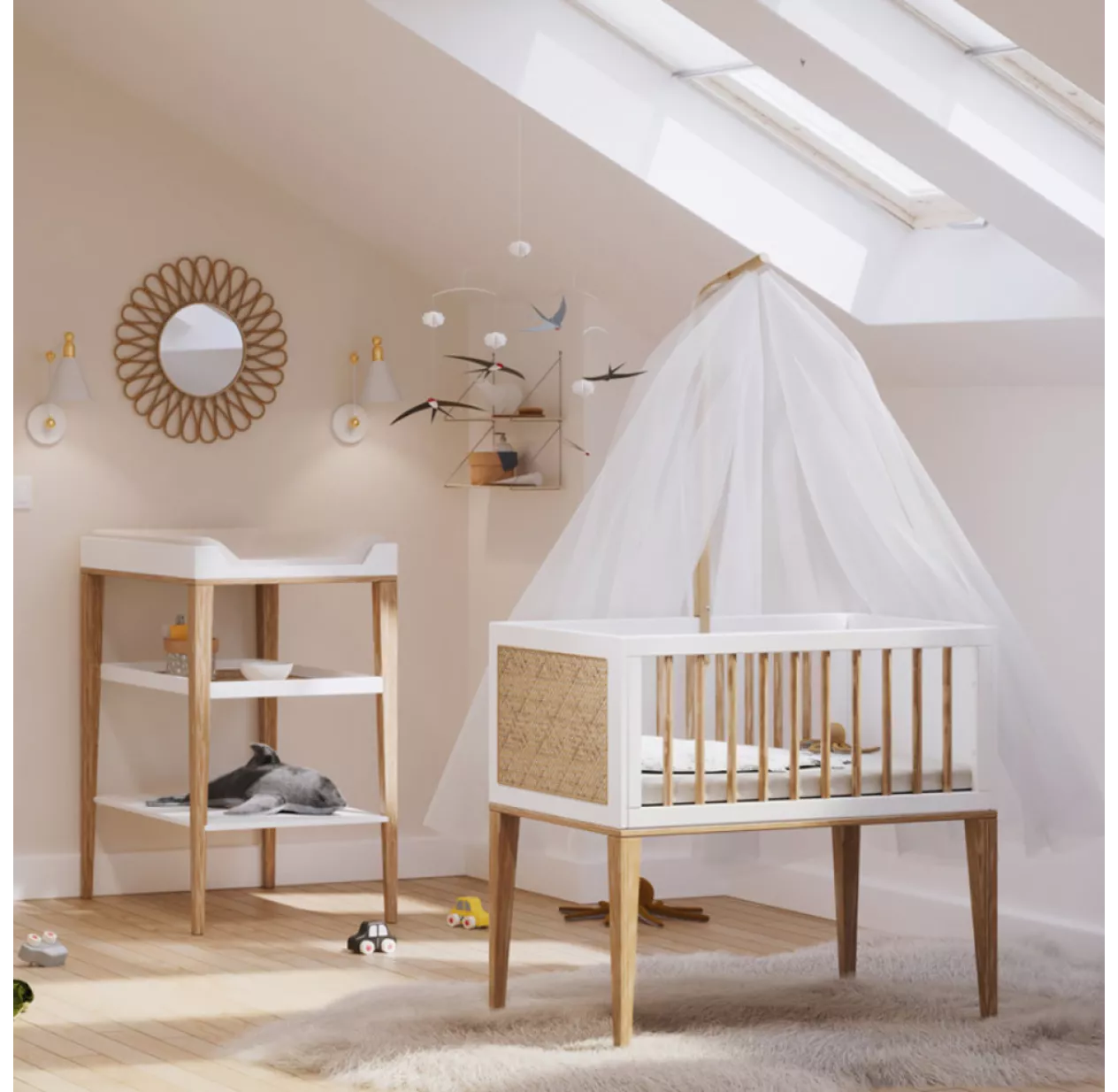 Coup de coeur pour cet adorable berceau en bois massif et cannage rotin. Livré avec sa flèche, le berceau Nami de Théo offre un couchage de 50 x 83 cm pour accueillir votre bébé de la naissance à 9 mois environ. On craque pour le style délicatement rétro de ce berceau en bois et cannage de rotin. En associant subtilement bois et rotin dans ses collections de mobilier enfant, la marque Théo propose un style de chambre à la fois contemporain et rétro qui apporte un vent de fraîcheur dans l’univers de la déco enfant.