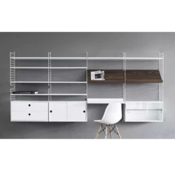 Vous pouvez aussi composer votre bureau STRING dans d’autres finitions: chêne, noyer, gris ou noir laqué…