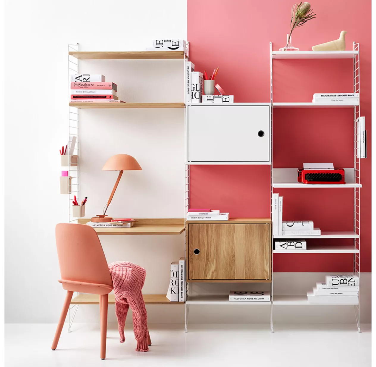 Vous pouvez également rajouter les étagères pour magazines, les étagères métalliques ou en bois, le plateau de bureau et tous les autres rangements modulables String. Vous pouvez aussi mélanger les couleurs.
