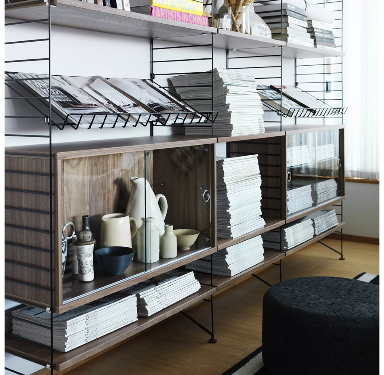 Vous pouvez également rajouter les étagères pour magazines, les étagères métalliques ou en bois, le plateau de bureau et tous les autres rangements modulables String. Vous pouvez aussi mélanger les couleurs.