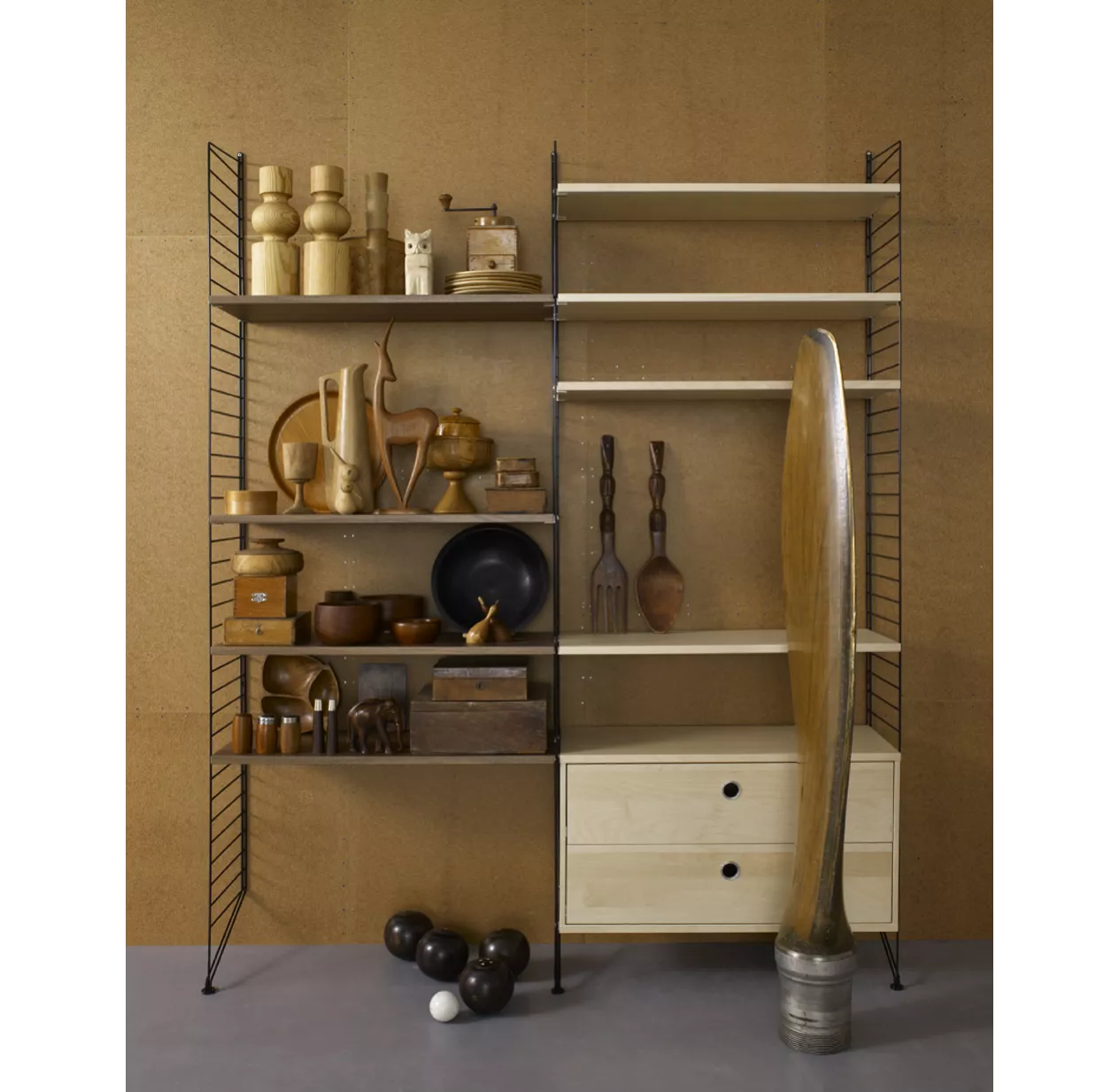 Ce caisson en noyer à tiroirs s’adapte aux portants muraux et portants au sol String. Vous pouvez créer votre propre composition murale grâce à ce caisson et créer un maximum de rangements.