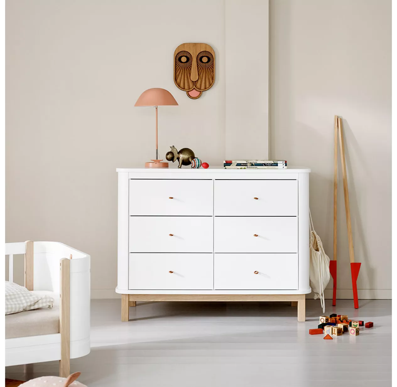 La commode est disponible avec les pieds en chêne massif ou en bouleau laqué blanc. Vous avez la possibilité de rajouter le petit plan à langer Wood ou le grand plan à langer Wood d’Oliver Furniture, disponibles en option.