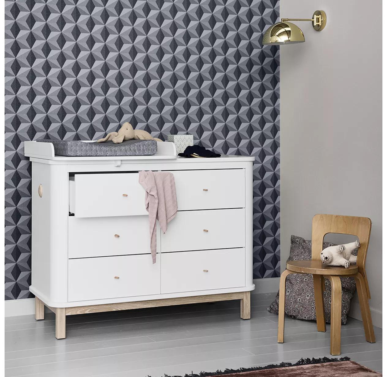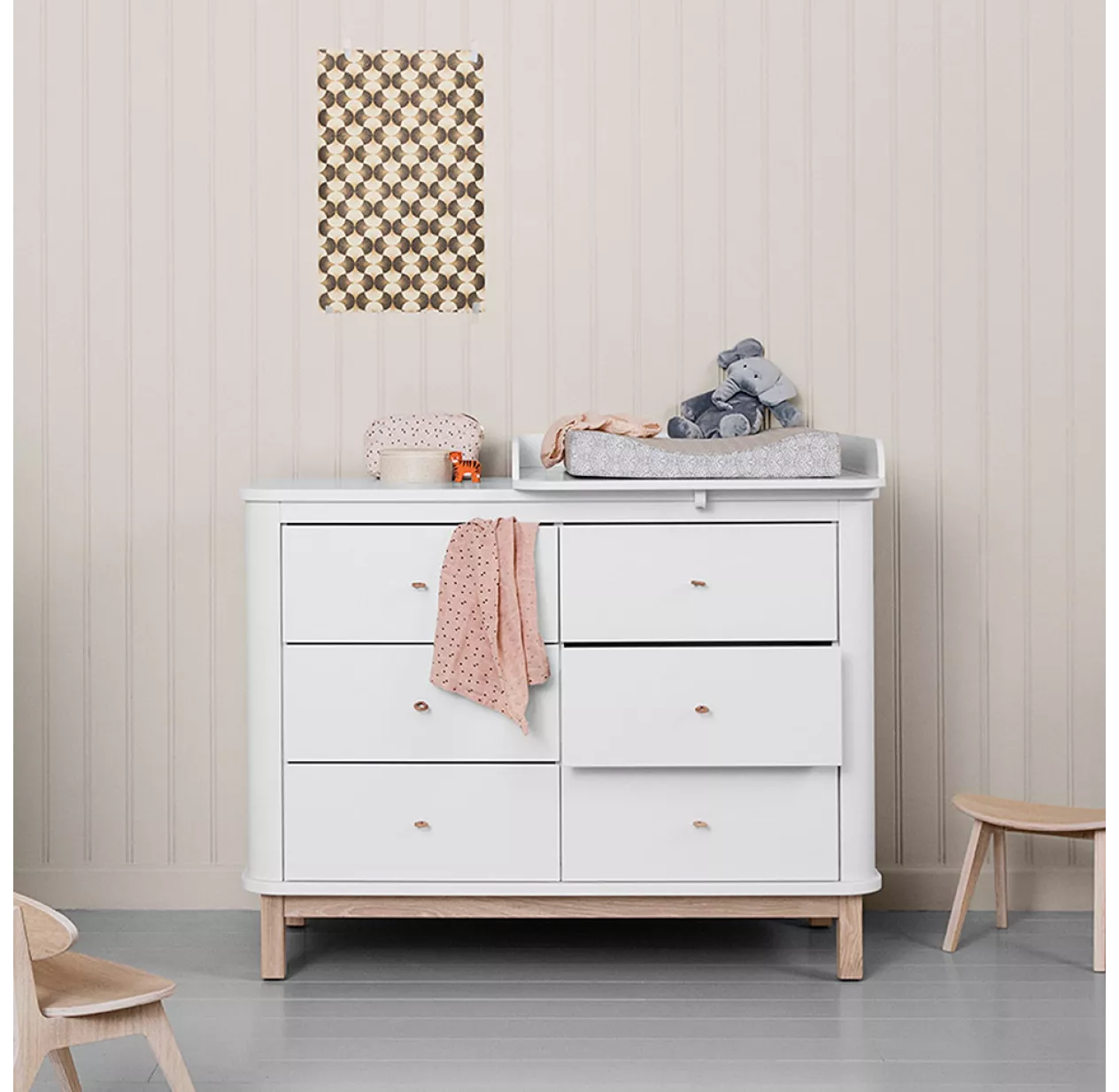 Cette commode à langer scandinave est disponible avec les pieds en chêne massif ou en bouleau laqué blanc mais également avec un grand plan à langer.