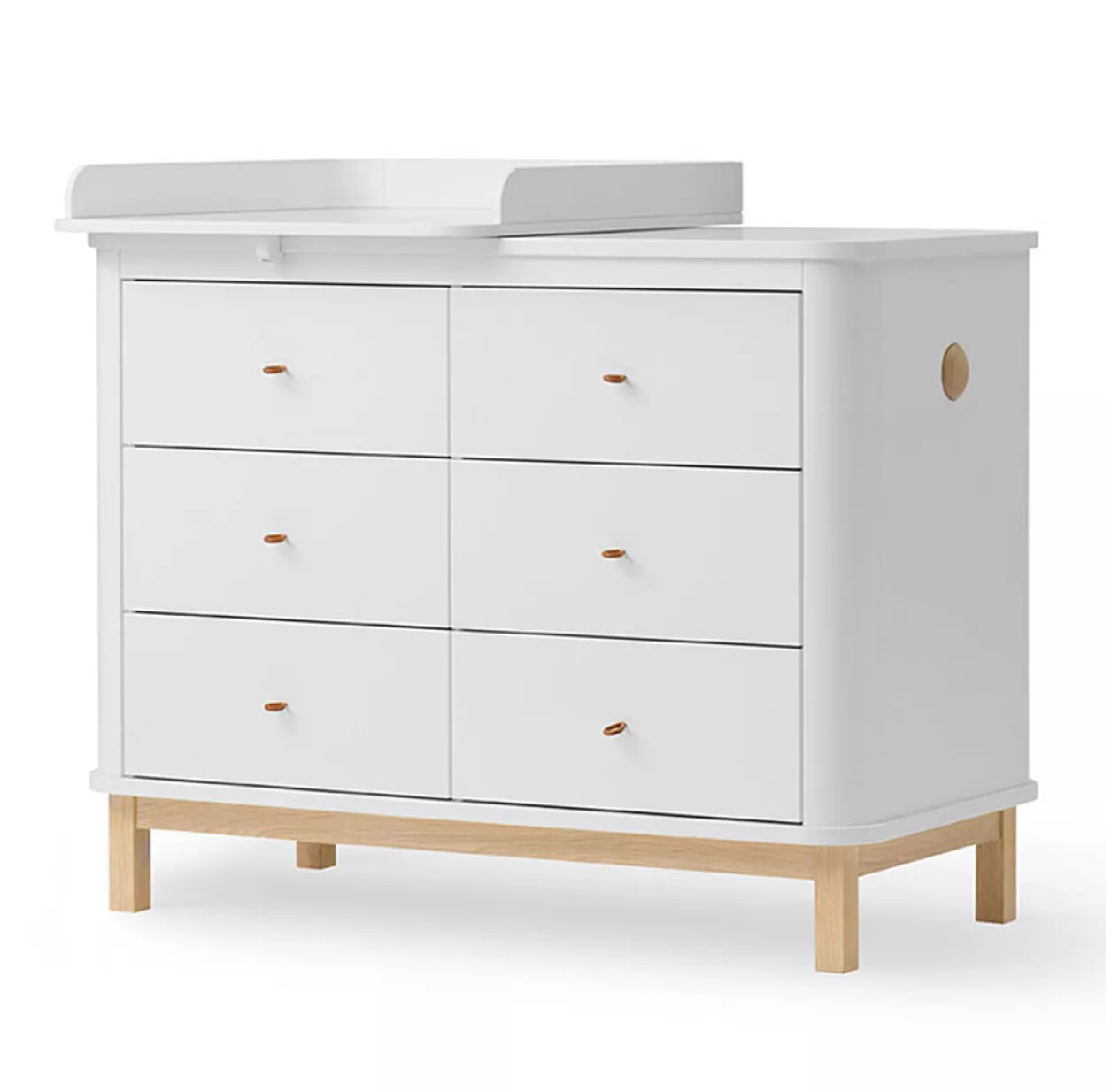 Cette commode blanche et en chêne de la collection Wood, possède 6 tiroirs et un petit plan à langer, vous pourrez donc changer votre bébé en toute facilité. Craquez pour son design scandinave et épuré, pour une chambre à la décoration légère. Les poignées de la commode sont en cuir et sont fabriquées à la main. De fabrication artisanale, vous allez l’adorer. Elle dispose également de petits portants ronds sur les côtés, extensibles qui se tirent facilement, pour suspendre des vêtements. Très fonctionnelle, vous pourrez enlever le petit plan à langer de la commode, une fois que votre bébé aura grandi.
