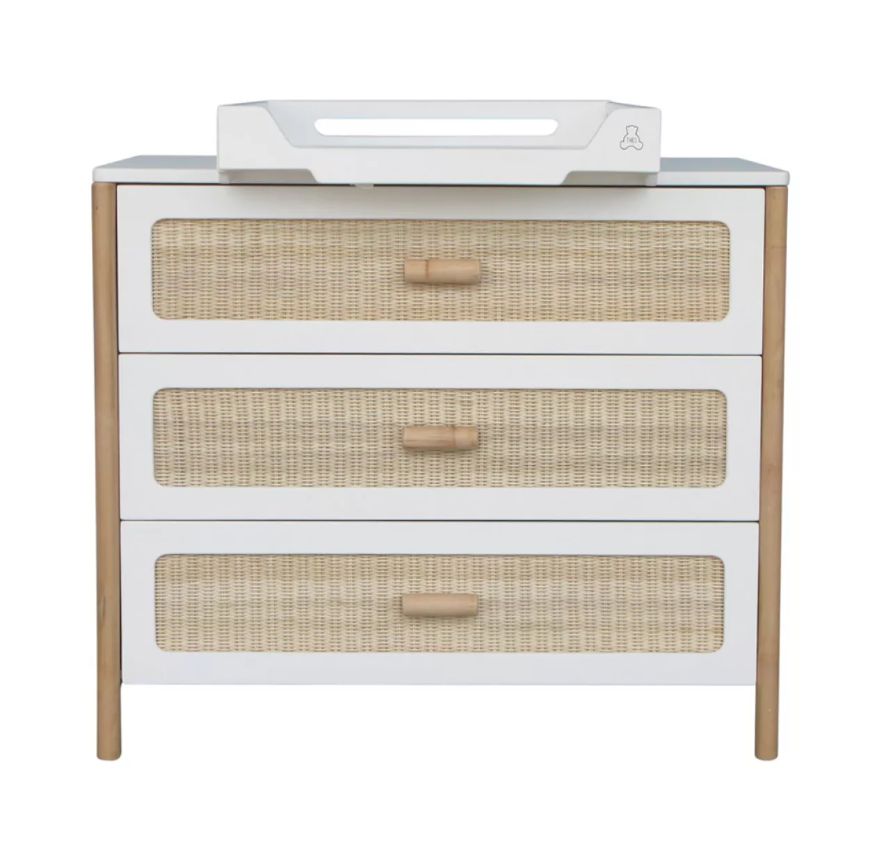 La commode Océania Théo dispose de 3 tiroirs en cannage de rotin tressé. Elle constitue un magnifique meuble déco d’inspiration vintage. Vous pouvez lui associer le plan à langer blanc Théo pour transformer temporairement le meuble en commode à langer. Ses tiroirs à fermeture douce, son style bohême et sobre en font un meuble parfaitement adapté à la chambre de votre bébé. Elle s’associe au lit bébé, au lit enfant, à la table à langer ou encore à l’armoire de la même collection pour une chambre complète déco et durable. En associant subtilement bois et rotin dans ses collections de mobilier enfant, la marque Théo propose un style de chambre à la fois contemporain et rétro qui apporte un vent de fraîcheur dans l’univers de la déco enfant.
