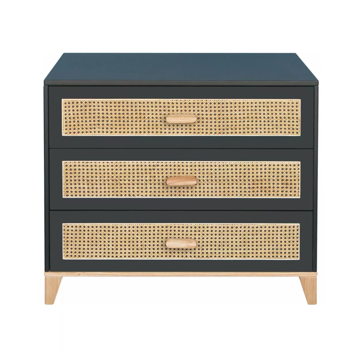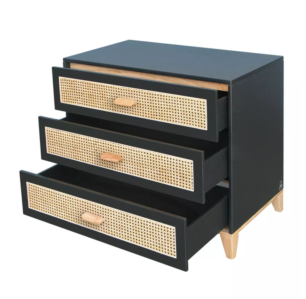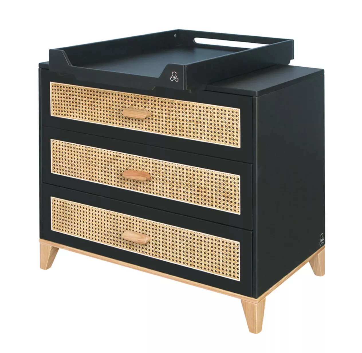 La commode Nami Théo dispose de 3 tiroirs en cannage de rotin. Elle constitue un magnifique meuble déco d’inspiration vintage. Vous pouvez lui associer le plan à langer blanc Théo ou le nouveau plan à langer en rotin pour transformer temporairement le meuble en commode à langer. Ses tiroirs à fermeture douce, son style rétro et sobre en font un meuble parfaitement adapté à la chambre de votre bébé. Elle s’associe au lit bébé, au lit enfant, à la table à langer ou encore à l’armoire de la même collection pour une chambre complète déco et durable. En associant subtilement bois et rotin dans ses collections de mobilier enfant, la marque Théo propose un style de chambre à la fois contemporain et rétro qui apporte un vent de fraîcheur dans l’univers de la déco enfant.