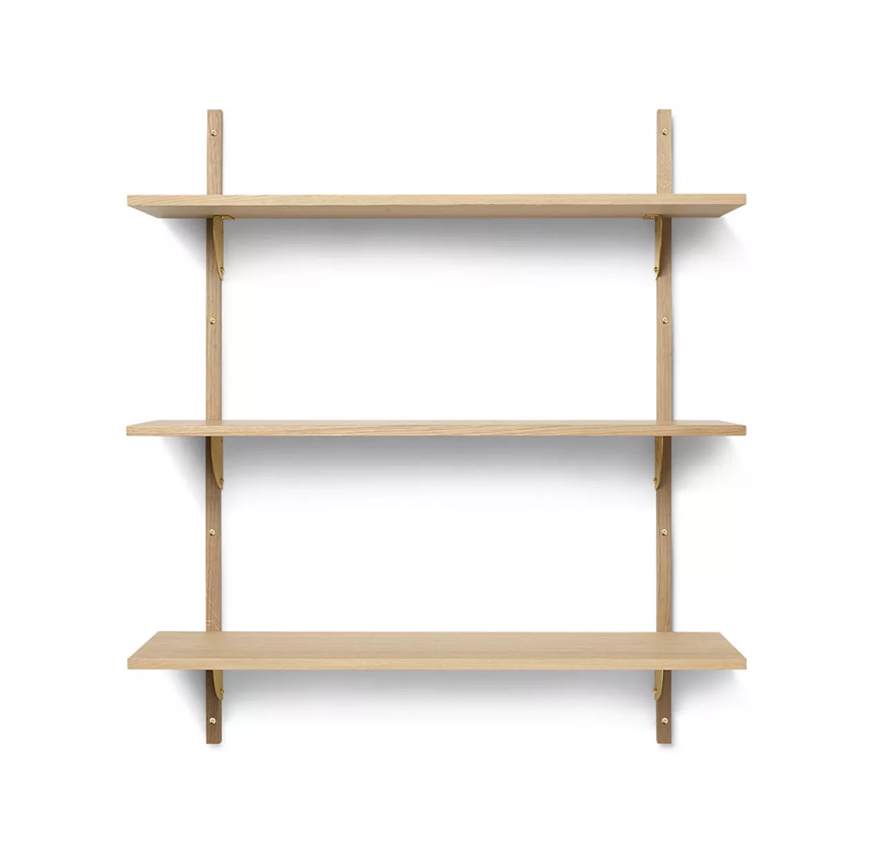 Le système modulaire Sector revisite l’étagère murale du milieu du siècle dans une version moderne et fonctionnelle. L’étagère Sector affirme une simplicité robuste dans un esprit naturel et minimaliste. Dans cette version Large et triple, l’étagère Sector associe placage de chêne naturel et laiton. Elle est aussi disponible en placage de frêne teinté noir et ses supports en laiton poli existent également en laiton noirci. L’étagère Triple Large Sector de Ferm Living se fixe au mur avec des montants en bois massif et des vis apparentes. Elle est idéale pour mettre en scène vos objets préférés dans une chambre enfant, un salon, des plantes ou des pots de rangement dans une cuisine. Elle s’associe parfaitement au bureau mural Sector qui se décline dans les mêmes couleurs et finitions.