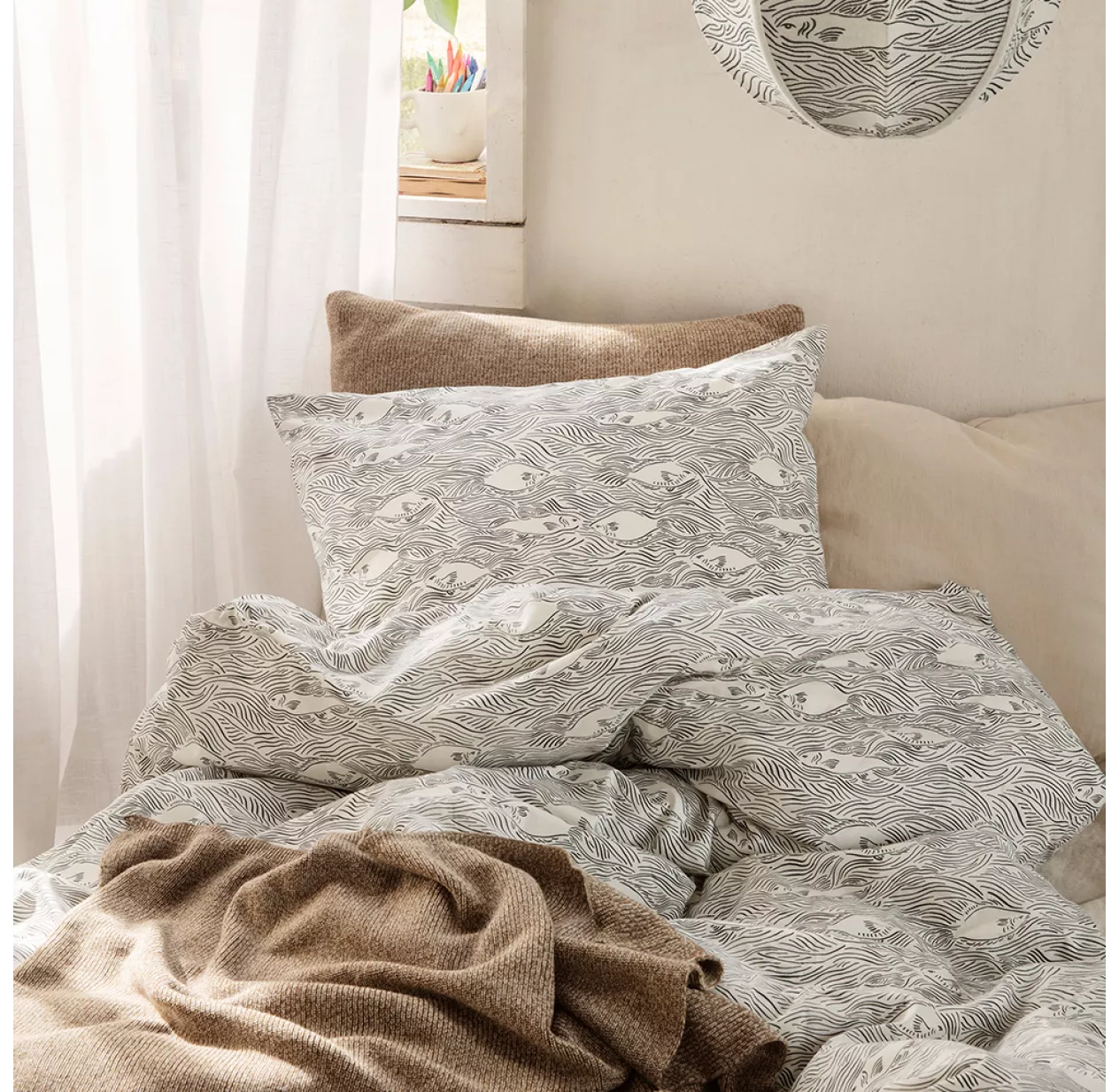 La parure de lit Stream de Ferm Living offre un motif graphique de courant marin aux multiples poissons. Idéale pour une chambre enfant dans une maison de vacances ou en bord de mer, cette parure de lit apportera une vraie touche déco raffraichissante. A voir cette parure de lit en situation, on aurait presque envie de plonger dans les flots agités de sa housse de couette et de se lover dans son écume ! La parure de lit Stream de Ferm Living est en coton biologique, sa housse de couette se ferme à l’aide d’une fermeture éclair. Elle se décline en 2 tailles: junior 100 x 140 cm et adulte (pour un lit simple) 140 x 200 cm.