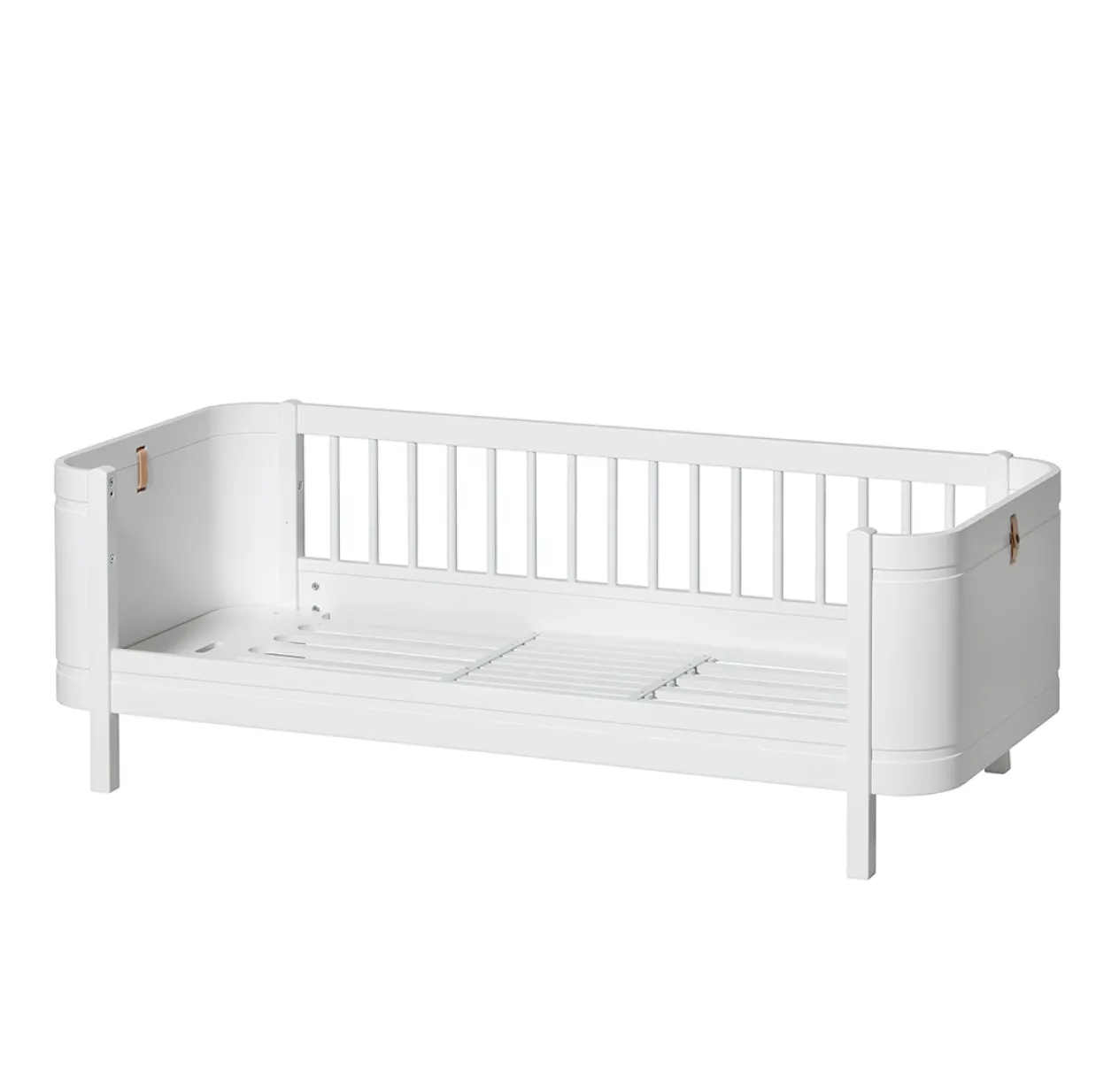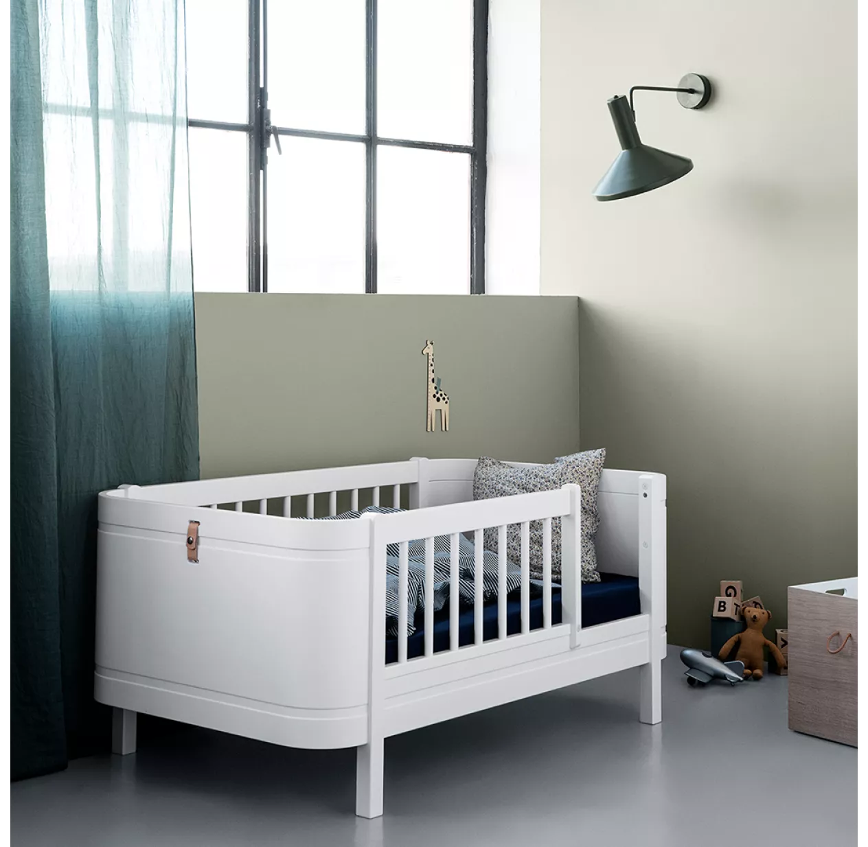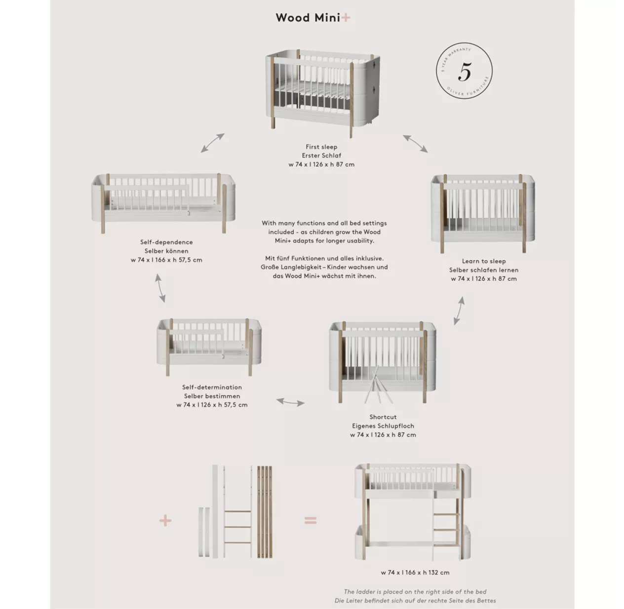 Le lit bébé évolutif 5 en 1 Mini+ Wood est également disponible en blanc et chêne.