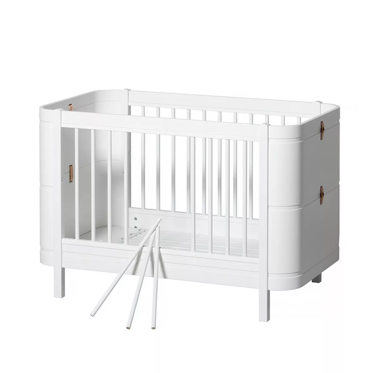 Dimensions lit bébé Mini+ Wood : largeur : 74 cm, longueur : 126 cm et hauteur : 87 cm.