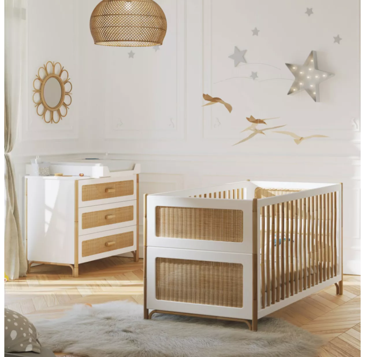 Le lit bébé Océania Théo est un lit évolutif dont le couchage en 70 x 140 cm permet d’accompagner votre bébé de la naissance jusqu’à 5 ans. Son sommier est réglables en 3 hauteurs. Le lit bébé Océania peut être associé au plan à langer qui se fixe directement sur les rebords du lit. Un kit de conversion disponible en option vous permet de transformer ce lit bébé en un élégant lit junior. Le design sobre et épuré du lit Océania Théo est idéal pour une chambre bébé durable. En associant subtilement bois et rotin dans ses collections de mobilier enfant, la marque Théo propose un style de chambre à la fois contemporain et rétro qui apporte un vent de fraîcheur dans l’univers de la déco enfant.