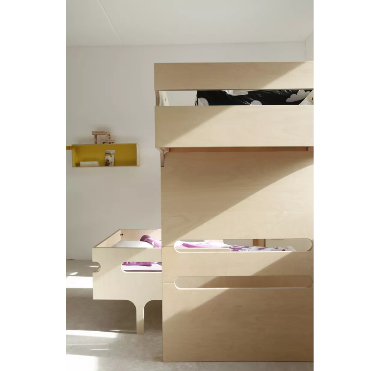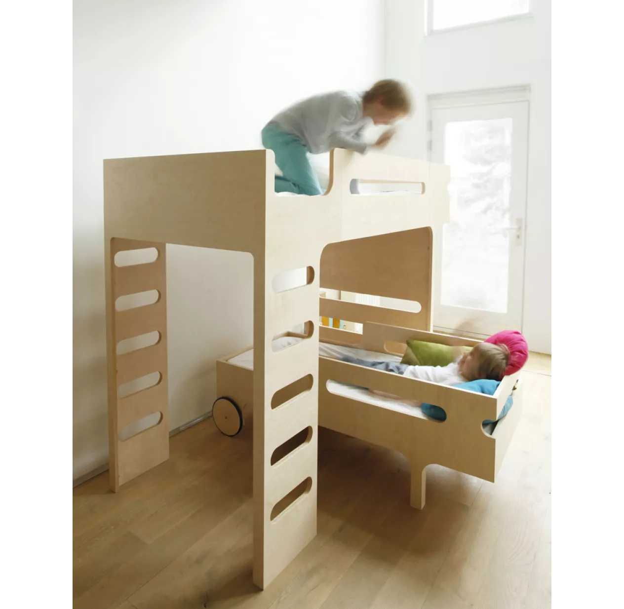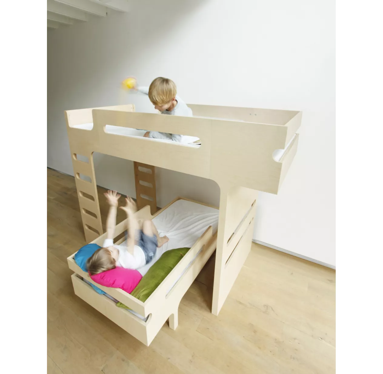 Le lit mezzanine F Bunk Bed dispose de 2 échelles, une de chaque côté, pour vous donner encore plus de liberté dans l’aménagement de la chambre de vos enfants. Un double accès qui lui donne aussi un air de cabanne suspendue. La stabilité du lit mezzanine est renforcée par une cloison ajourée qui fait office de pied. Ses ouvertures créent une communication ludique avec l’espace situé sous le lit. Le lit mezzanine F Bunk Bed convient à l’enfant dès 6 ans.
