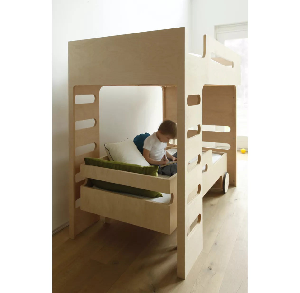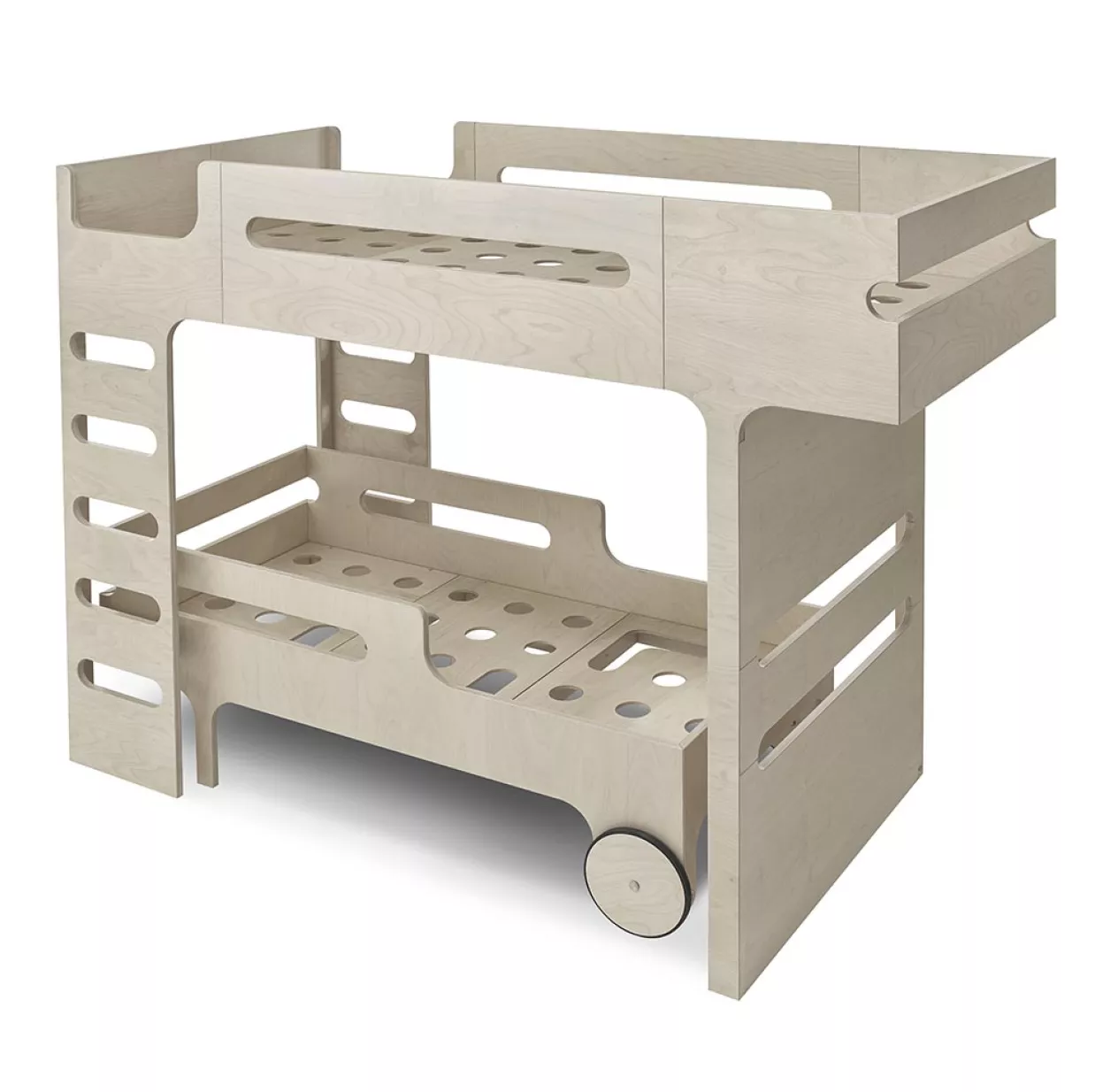 Le lit junior R Toddler Bed dispose de 2 roues qui joignent l’esthétique au fonctionnel. Elles lui donne un air de véhicule imaginaire comme pour mieux laisser vagabonder ses rêves. Le lit junior R Toddler Bed dispose de barrières de sécurité ajourées qui permettent à l’enfant de regarder ce qu’il se passe de l’autre côté.
