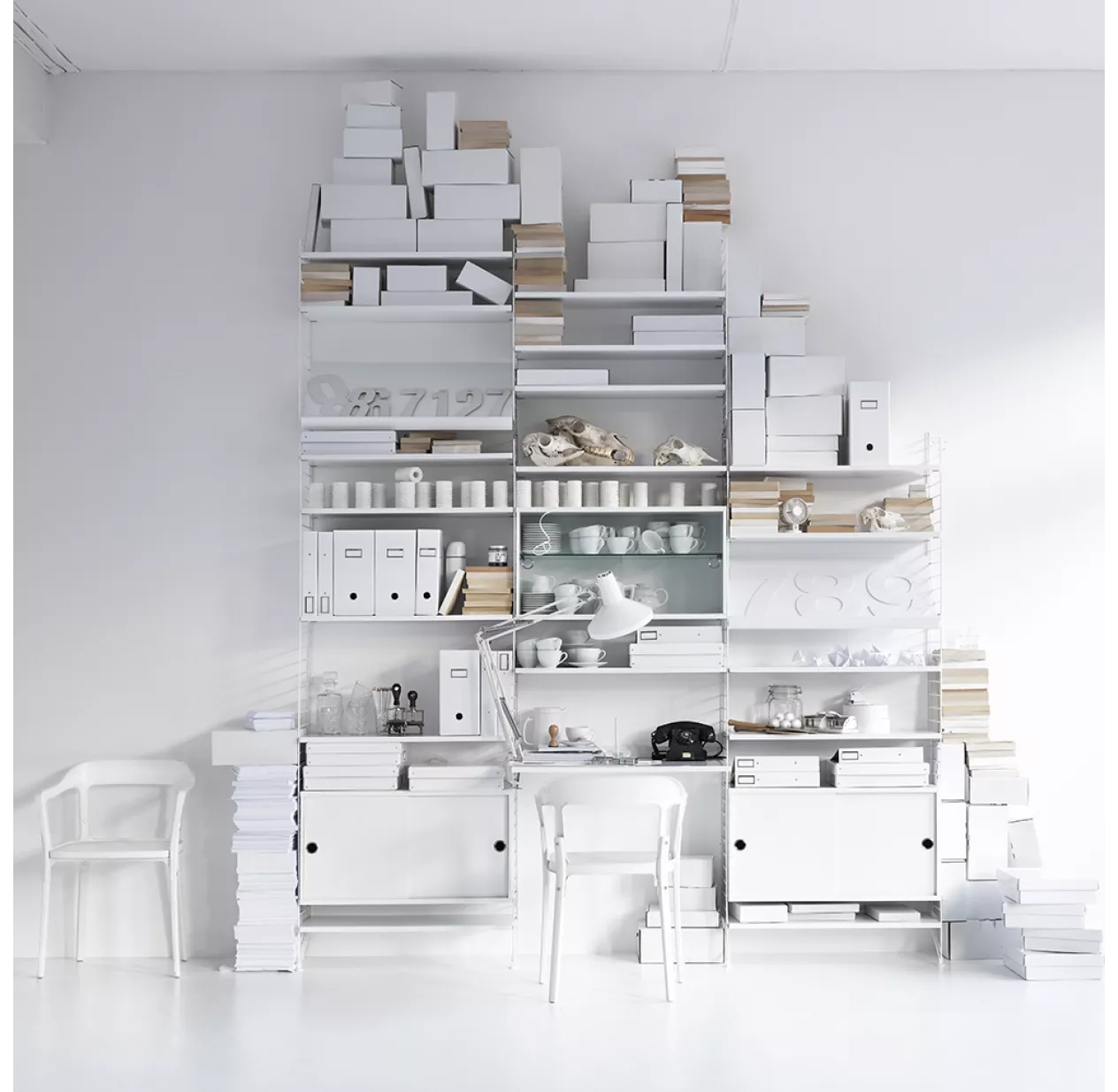 Vous pouvez également rajouter les caissons de rangement, le plateau de bureau, les étagères pour magazines, les étagères métalliques, la table murale pliante et tous les autres rangements modulables String. Vous pouvez aussi mélanger les couleurs.