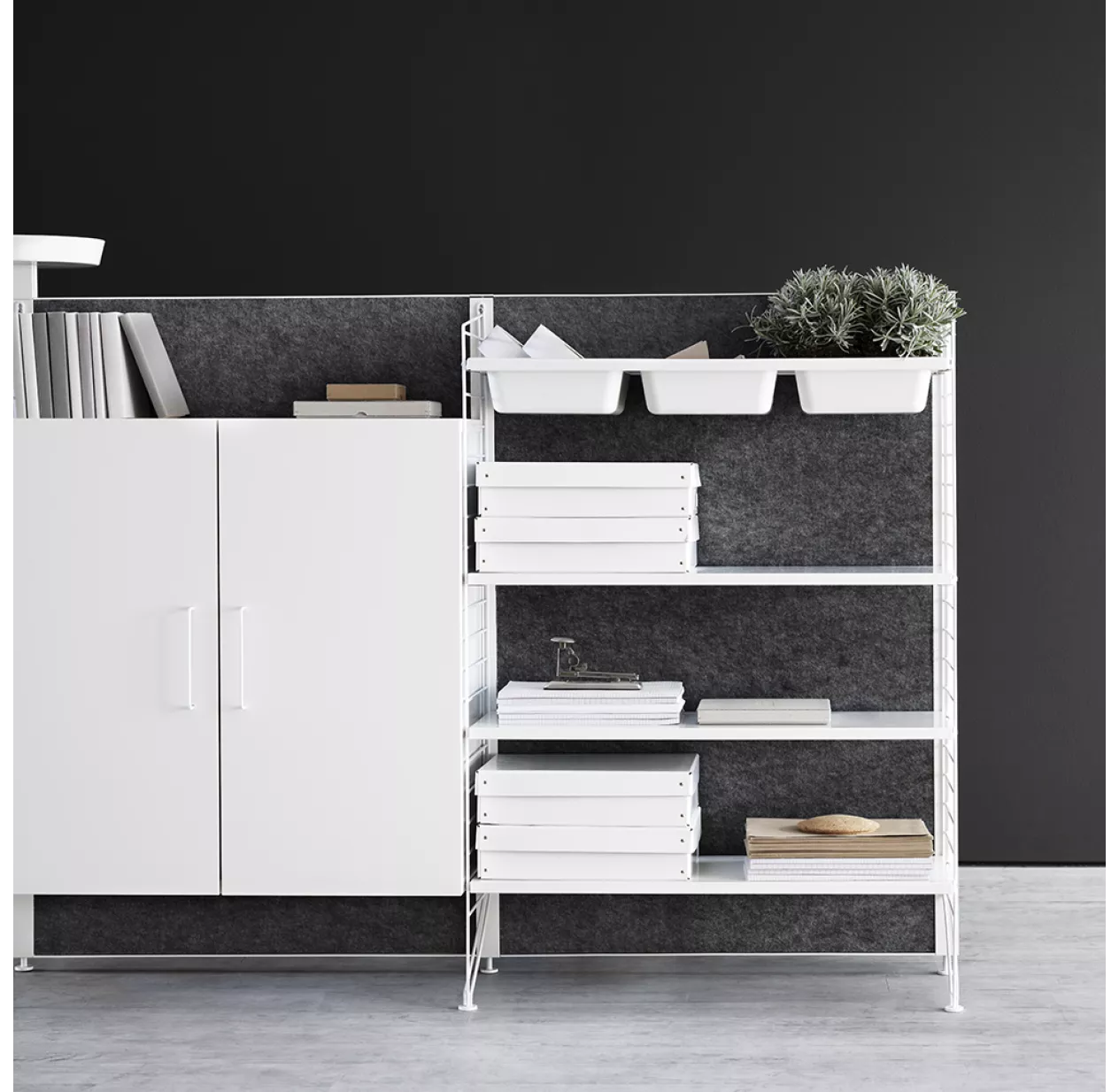 Ce rangement blanc à 2 portes s’adapte aux portants muraux et portants au sol String de 30 cm de profondeur. Vous pouvez créer votre propre composition murale en ajoutant tous les rangements String que vous souhaitez.