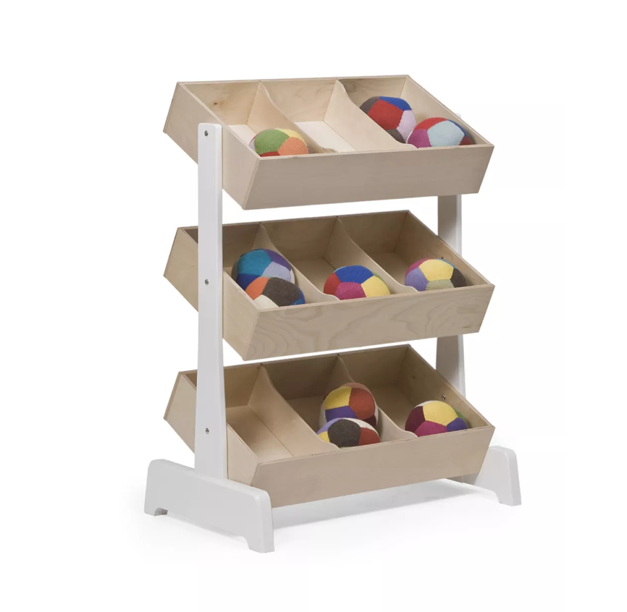 On aime son design épuré et sobre qui lui donne un côté « jeu de construction ». Ce meuble de rangement fonctionnel est constitué de 3 étagères compartimentées en 3 bacs de rangement chacune. Elles s’inclinent pour être accessibles aux plus petits. Toy store est le coffre à jouets idéal. Les séparateurs se déplacent pour ajuster la taille des bacs. Un pour les Playmo, un pour les Legos, un pour les voitures… Il y aura de la place pour tout le monde !